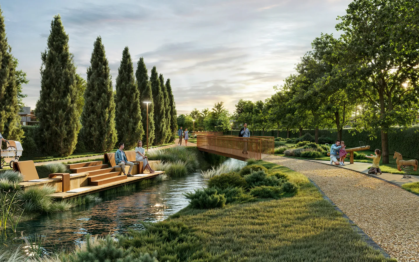 Здесь формируется исключительное пространство для жизни и отдыха на природе, где ландшафт сохраняет свою подлинность, а развитие территории осуществляется через устойчивые решения и создание инфраструктурных объектов, доступных для жителей и гостей.